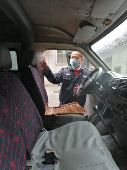 (对待命室、库房、车辆内多处喷洒消毒液进行消毒)
