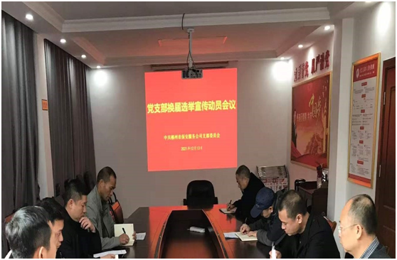 会上学习了《郴投集团党委基层党组织集中换届选举工作方案》,讨论通过了《中共郴州市保安服务公司支部委员会换届选举工作方案》,强调了支部委员候选人推荐的基本条件,并对换届工作流程和相关要求提出了指导性意见。