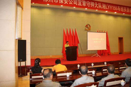 2016年7月30日上午,郴州市保安公司在竹园宾馆会议中心隆重召开了“郴州市保安公司宜章守押大队湘LYY155车组押运员英勇救人事迹表彰大会”。 市政法委、市国资委、市公安局、各金融单位的领导、公司全体管理人员、城区守押大队长、车长及各县守押大队长等参加了表彰大会。会议由公司副总经理曹亚军同志主持。